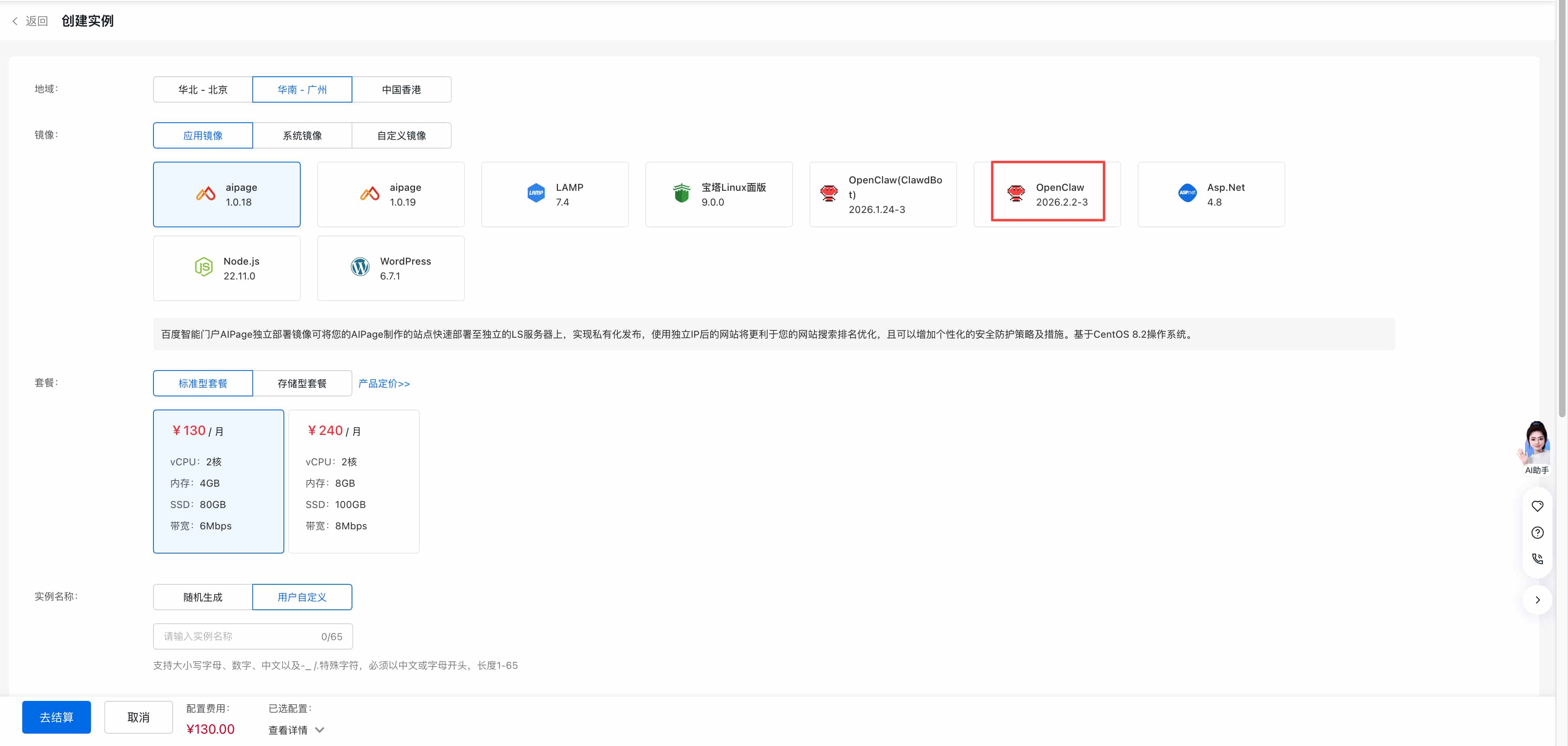 - 镜像:选择 OpenClaw 2026.2.2-3