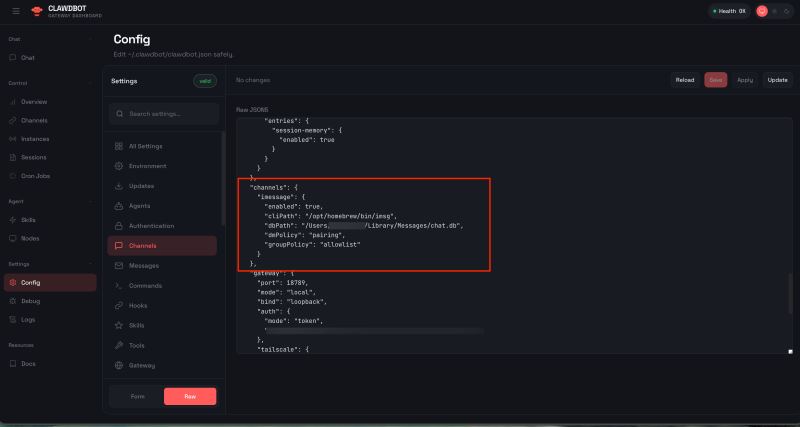 http://127.0.0.1:18789/- 在 Dashboard 左侧导航栏进入「Config」页面,找到「channels.imessage」相关配置项: