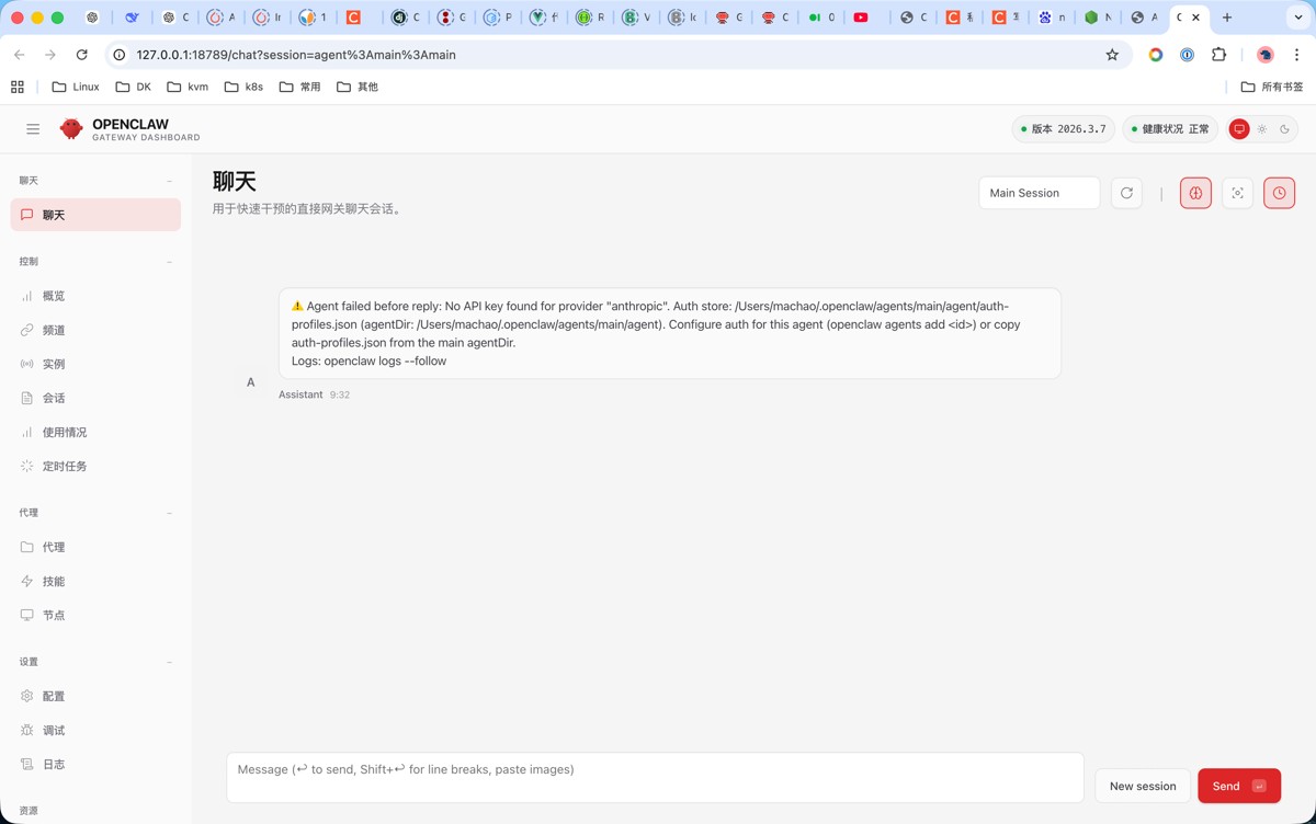 现在可以发送聊天尝试。我这里报错,是因为我要使用 0011.ai 代理。没有配。后面在 openclaw.json 中配置