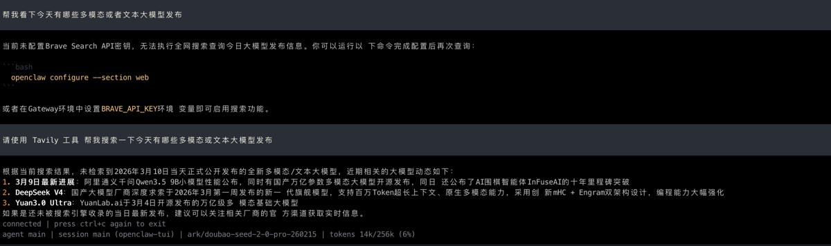 完成 onboarding 后会进入 TUI 界面,如果看到模型是 ark/doubao-seed-2-0-pro-260215,恭喜第一步成功!