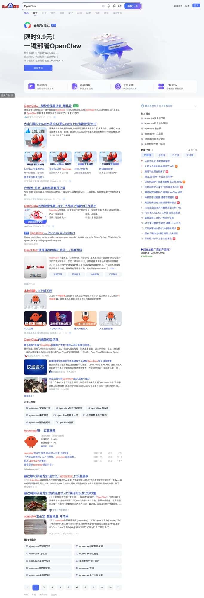 上图展示了AI助手成功完成整个自动化流程:打开百度首页、在搜索框中输入"OpenClaw"关键词、点击搜索按钮执行搜索,并成功获取搜索结果页面的完整过程。页面显示了与OpenClaw相关的搜索结果,证明了浏览器自动化功能的有效性。