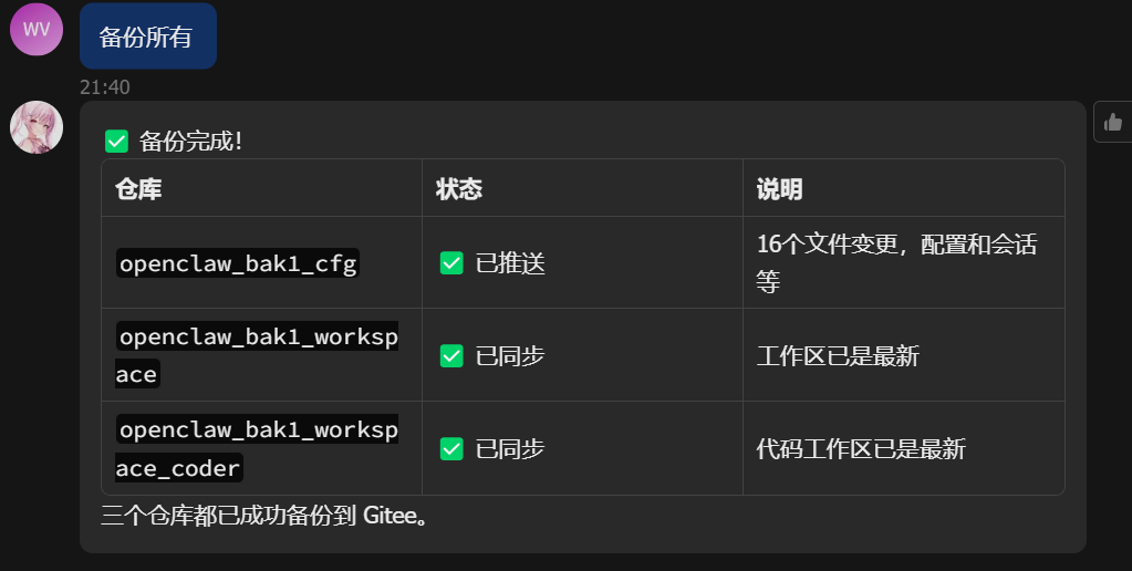 首次备份输入:/openclaw-gitbak备份所有(openclaw会记住你的备份手段) 以后备份输入:备份所有/备份workspace/备份配置 首次拉取输入:/openclaw-gitbak恢复所有(openclaw会记住你的恢复手段) 以后恢复输入:恢复所有/恢复workspace/恢复配置