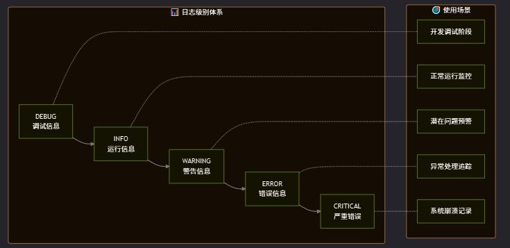 | CRITICAL | 50 | 严重错误,系统可能无法继续运行 | 数据库连接失败、核心服务崩溃 |