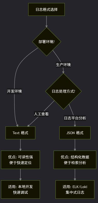 3. 输出格式选择:Text 格式适合开发调试,JSON 格式适合生产环境与日志平台集成,可根据实际需求灵活选择或组合使用。