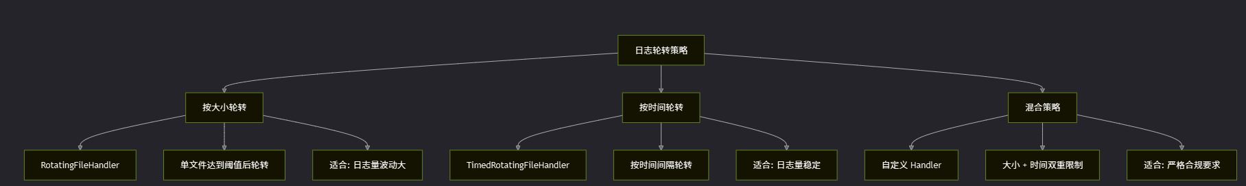 | TimedRotatingFileHandler | 文件(时间轮转) | 合规要求 | 按时间切分,便于归档 |