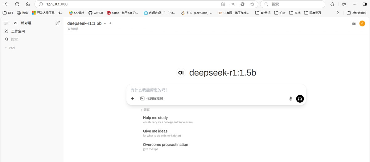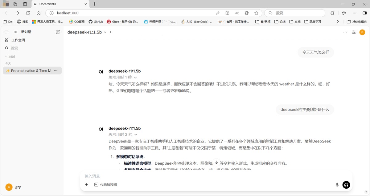 我们选择本地部署的deepseek-r1:1.5b模型,即可进行交互问答。