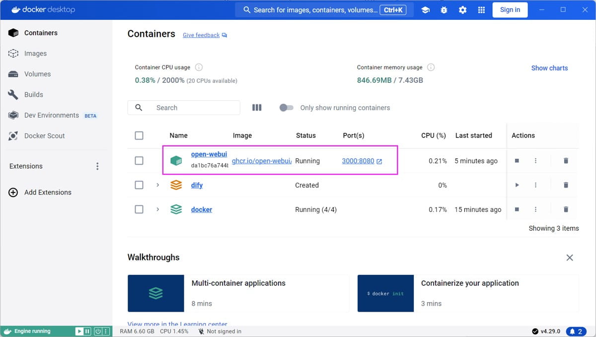 安装完成后,打开Docker应用界面即可发现出现了Open WebUI