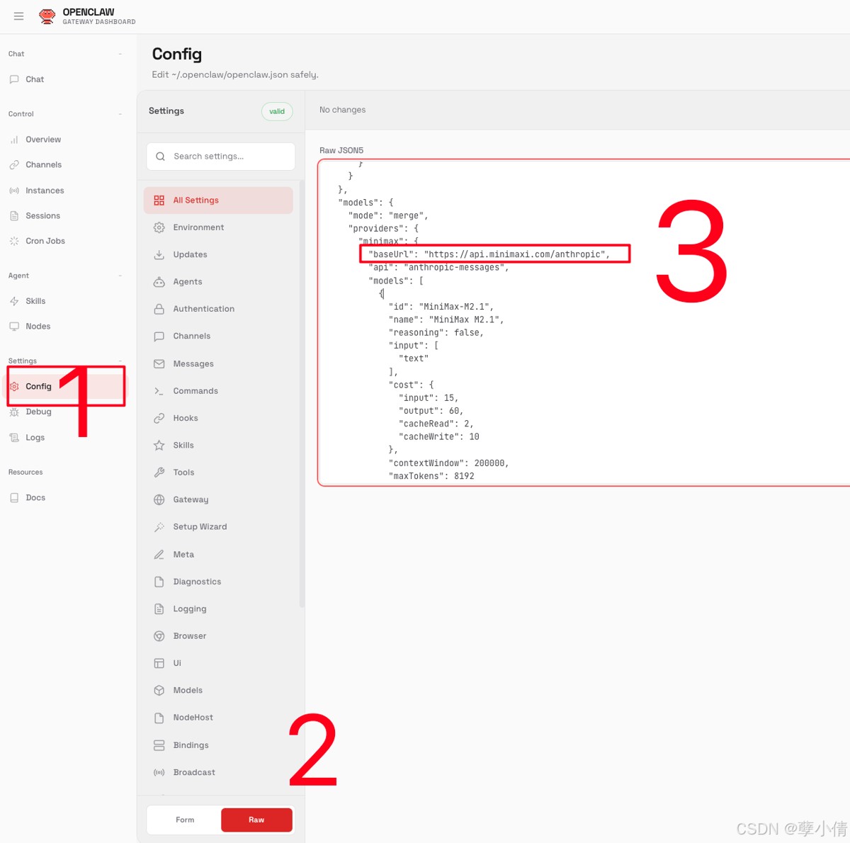 2. 在打开的webUI页面中,依次找到Config->Raw,然后找到“models”的配置,找到baseURL,