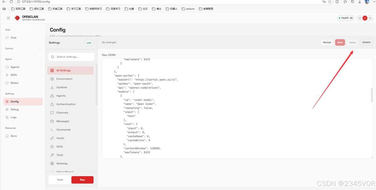 在 Openclaw配置界面完成修改后,先单击 Save,保存完成后单击 Update。