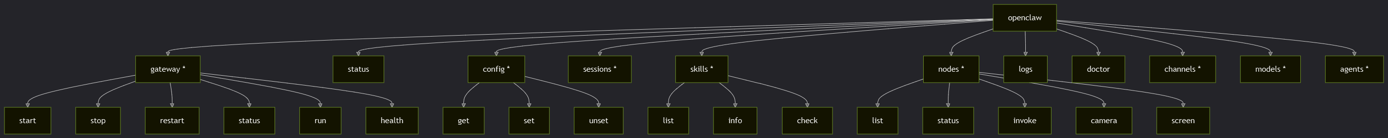 上图展示了 OpenClaw CLI 的主要命令层级结构。可以看到,gateway、config、sessions、skills、nodes 等命令都有各自的子命令,形成了一个完整的命令树。带有 * 标记的命令表示它们还有更深层的子命令。