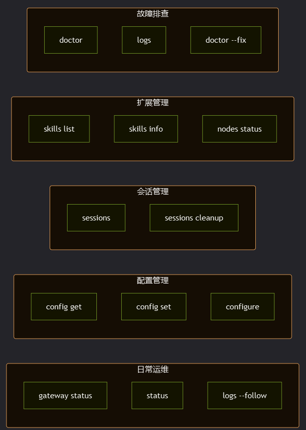 3. 配置与诊断:config 命令提供了配置管理能力,支持点号路径访问嵌套配置。doctor 命令则能自动诊断系统问题并提供修复建议。两者结合使用,可以快速定位和解决大部分配置问题。