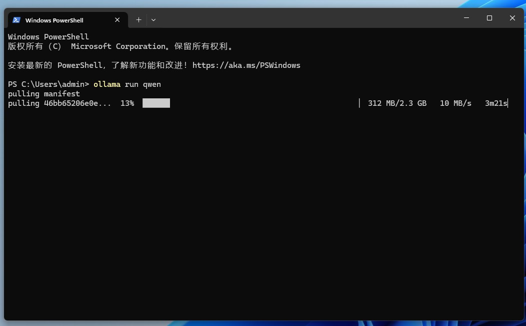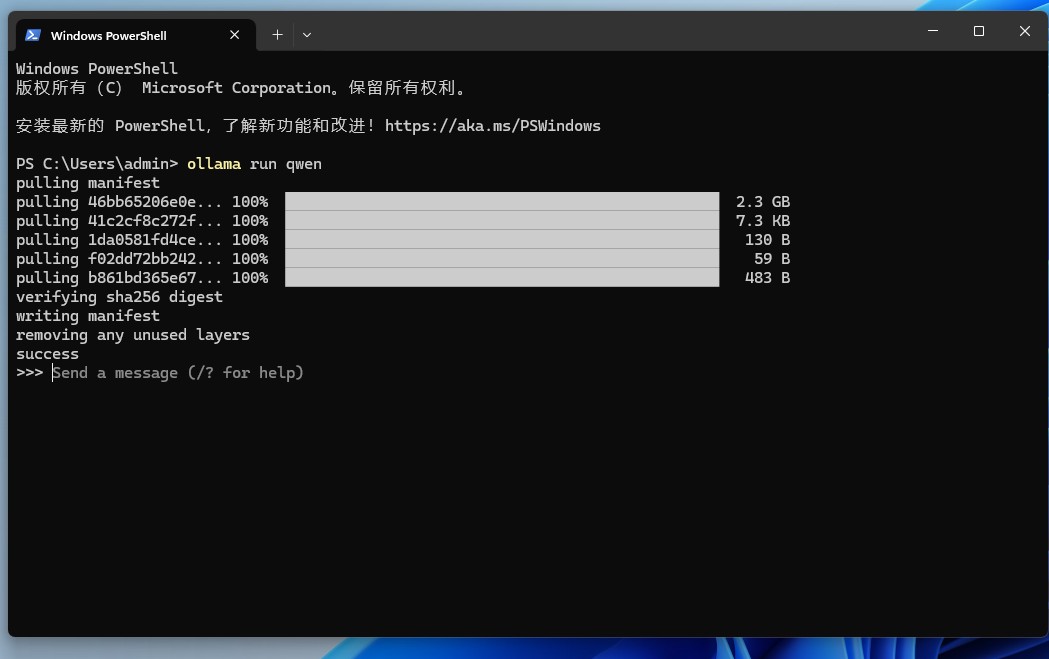 可以看到,系统正在下载 qwen 的模型(并保存在 C 盘,C:\Users<username>.ollama\models 如果想更改默认路径,可以通过设置OLLAMA_MODELS进行修改,然后重启终端,重启 ollama 服务。)