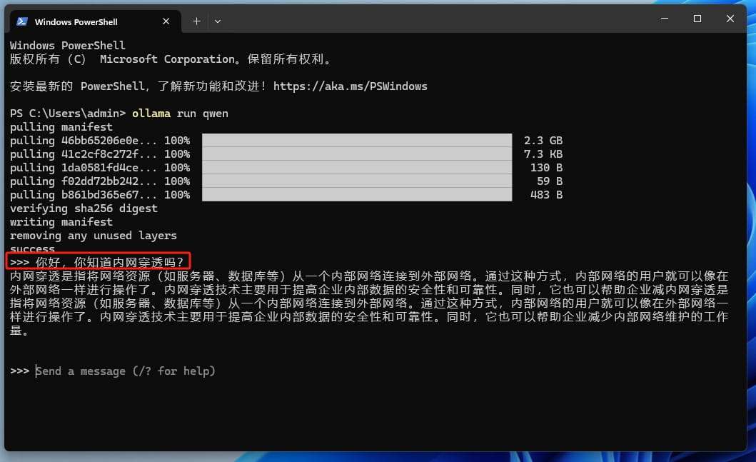 模型下载完成后,我们就可以在终端中输入问题进行使用了: