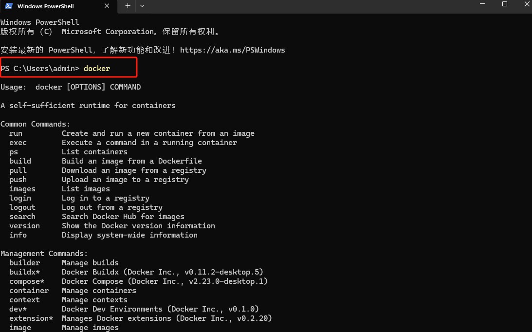 现在我们打开终端,比如 powershell,然后输入 docker,回车
