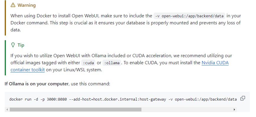 在 Open WebUI 的 github 页面 https://github.com/open-webui/open-webui 可以看到,如果你的 Ollama 和 Open WebUI 在同一台主机,那使用下面显示的这一行命令就可以在本地快速进行部署: