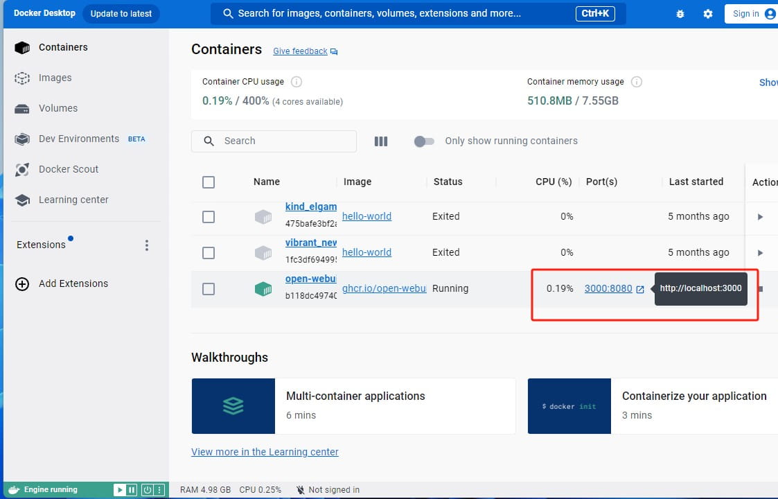 安装完成后,在 Docker Desktop 中可以看到 Open WebUI 的 web 界面地址为:https://localhost:3000