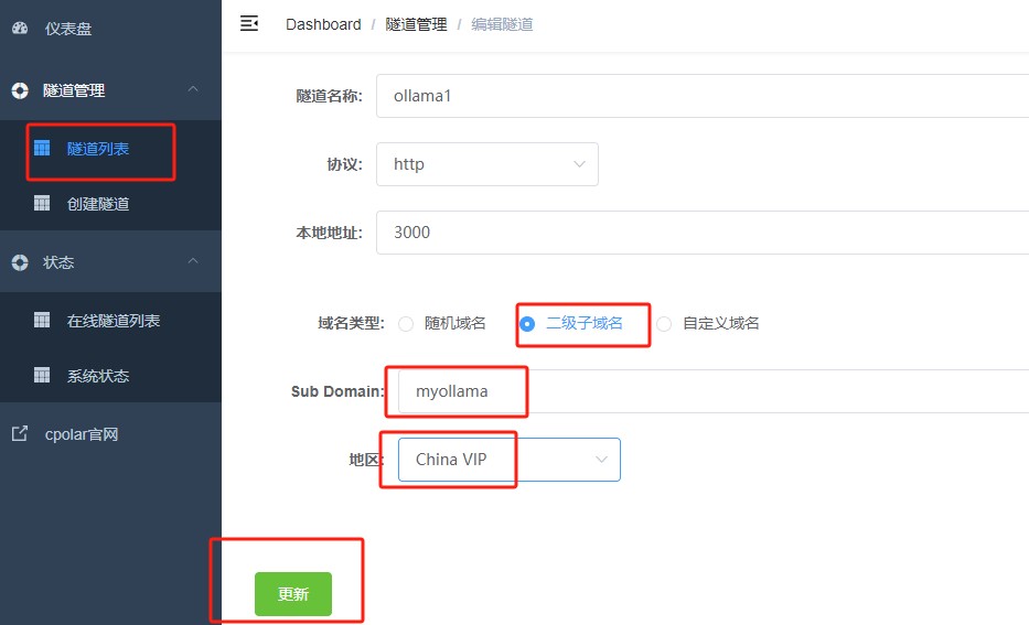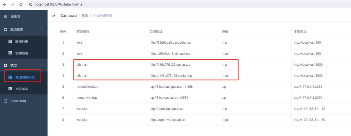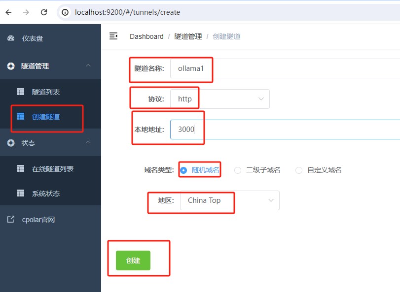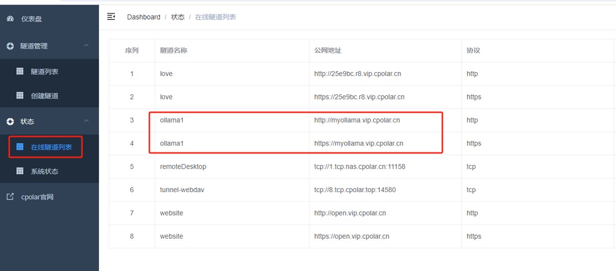 - 隧道名称:ollama1(可自定义命名,注意不要与已有的隧道名称重复)