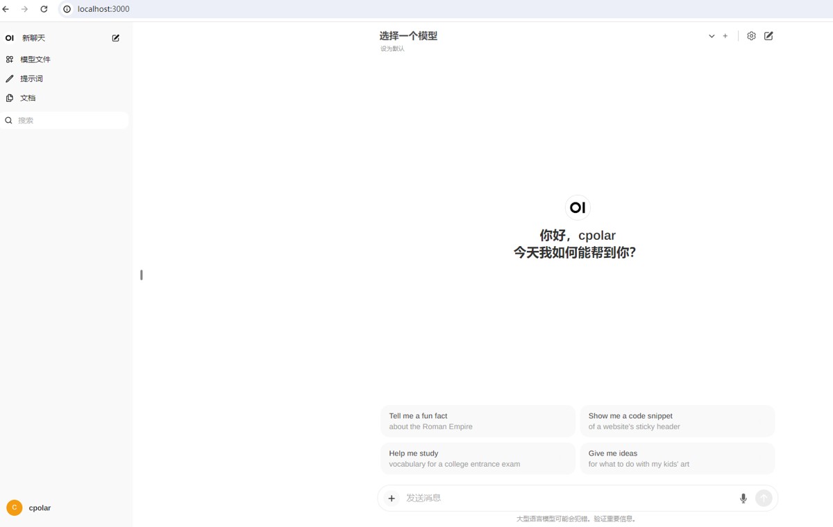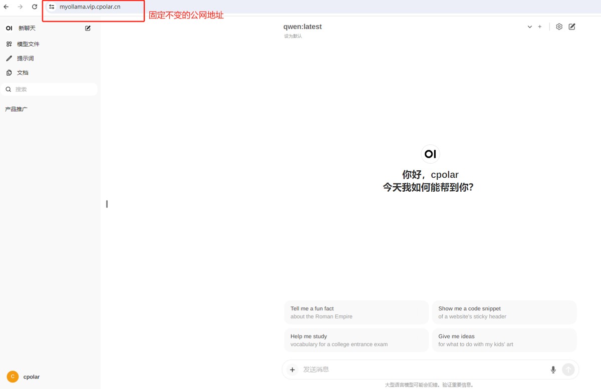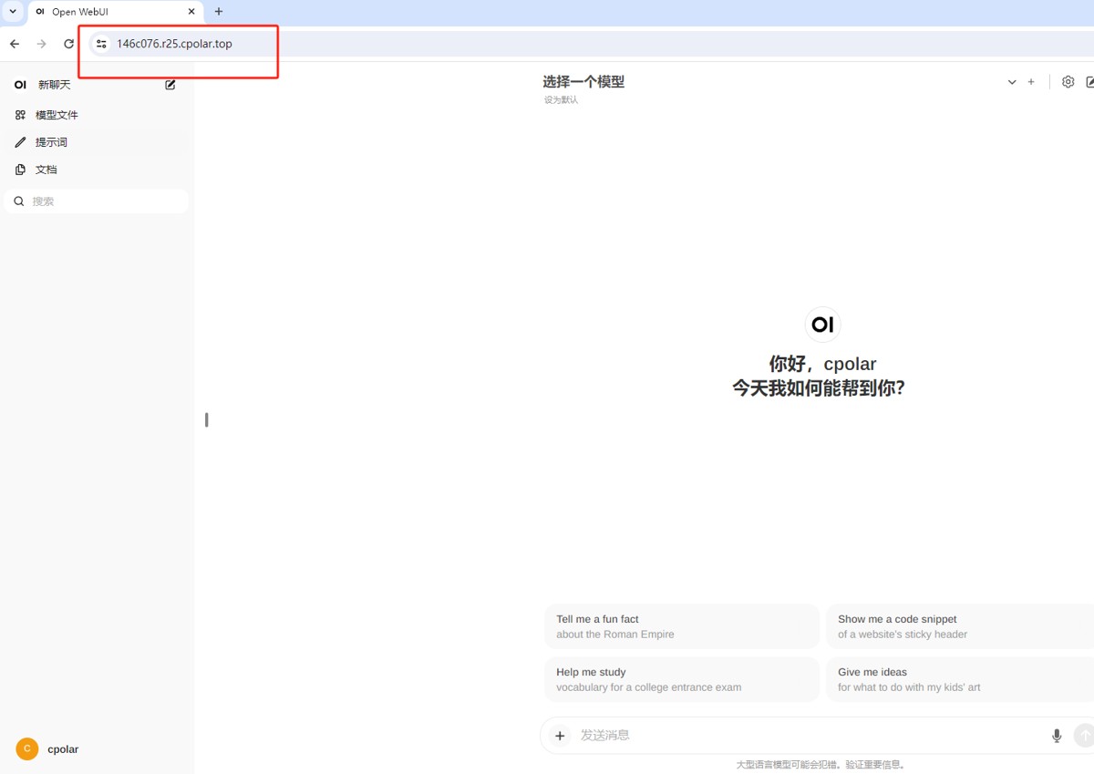 最后,我们使用固定的公网 https 地址访问,可以看到访问成功,这样一个固定且永久不变的公网地址就设置好了,可以随时随地在公网环境异地访问本地部署的 Open WebUI 了!