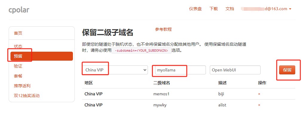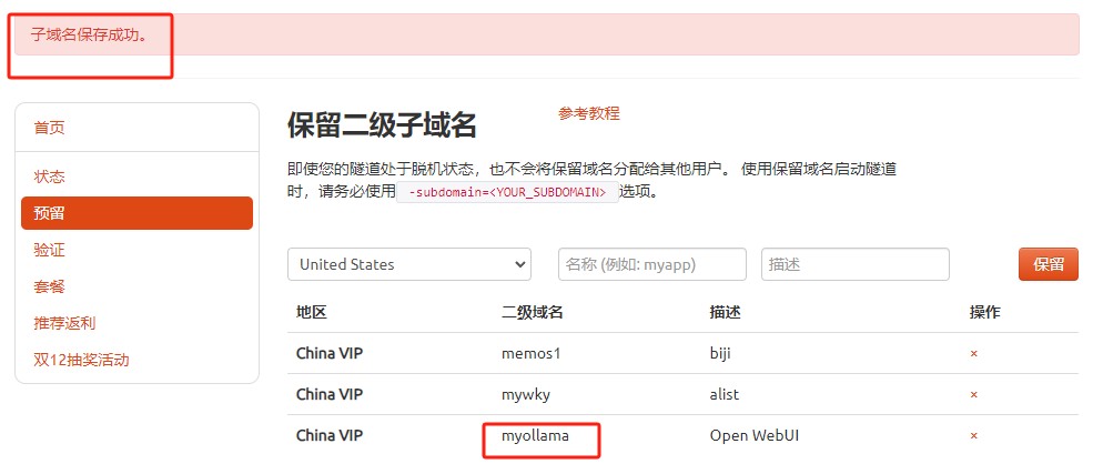 保留成功后复制保留成功的二级子域名的名称:myollama,大家也可以设置自己喜欢的名称。