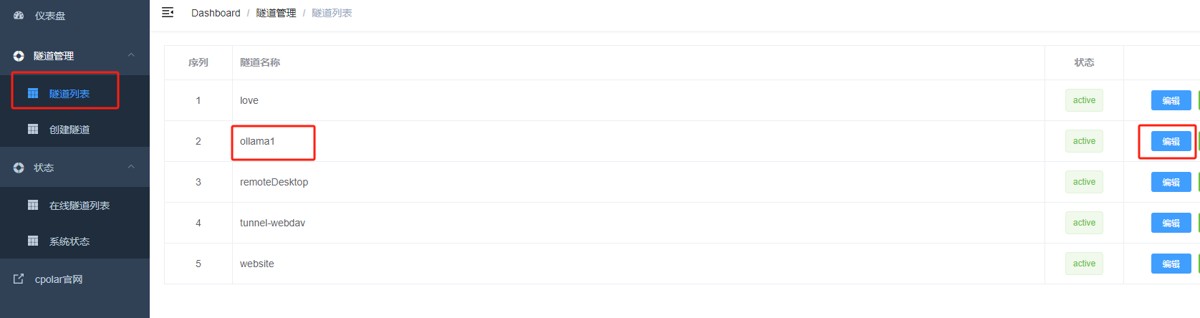 返回登录 Cpolar web UI 管理界面,点击左侧仪表盘的隧道管理——隧道列表,找到所要配置的隧道:ollama1,点击右侧的编辑: