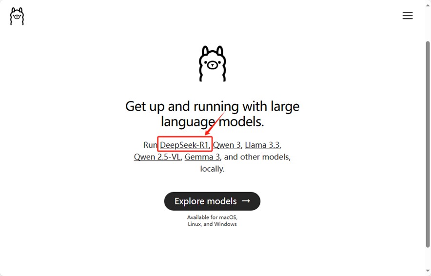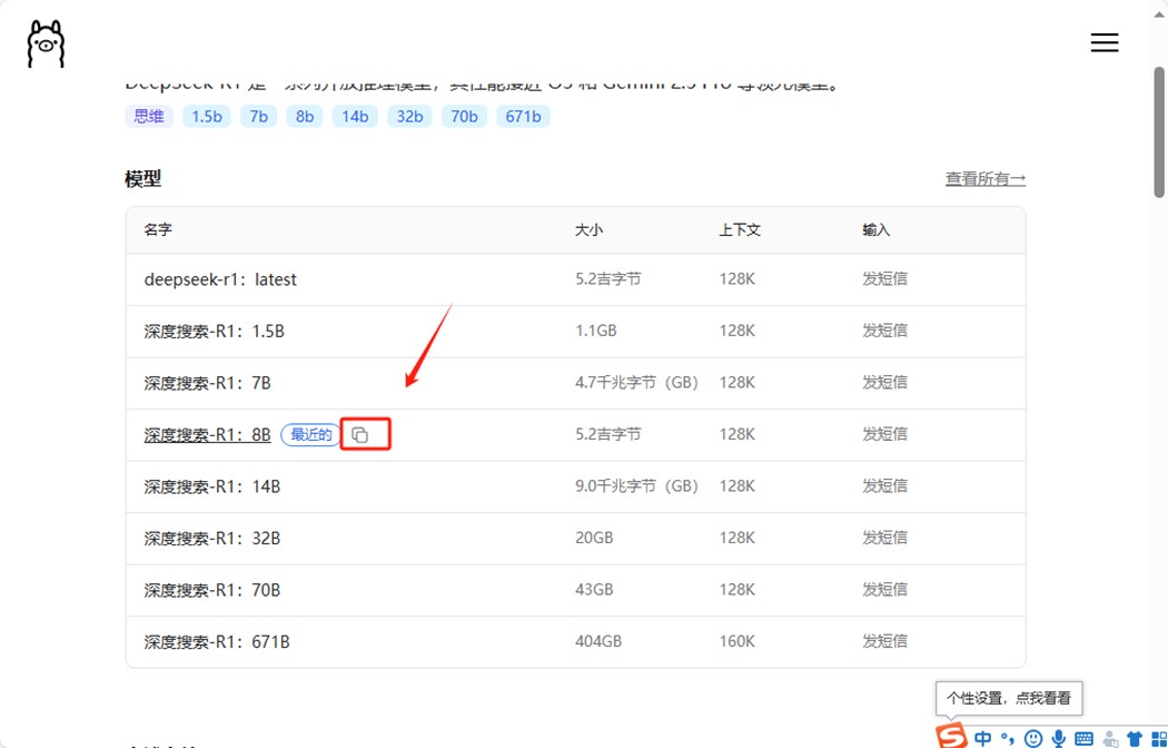 5、接下来到ollama官网首页,点击DeepSeek-R1,选择一个版本下载,版本越大模型量越大,本地部署质量越高,运行也就相应变慢,需要的电脑配置越高。