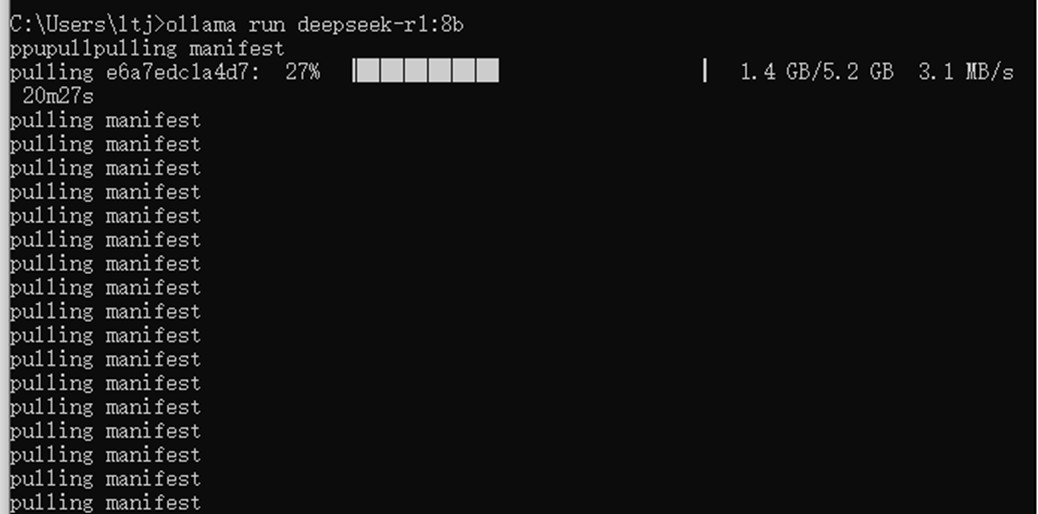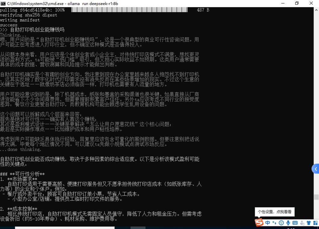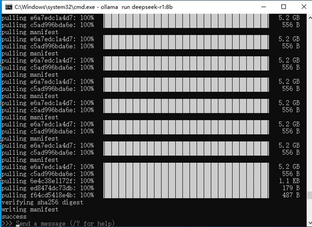 6、选择对应的版本,复制粘贴到cmd中,执行ollama run deepseek-r1:8b这条命令,等待显示success后,表示部署完毕。