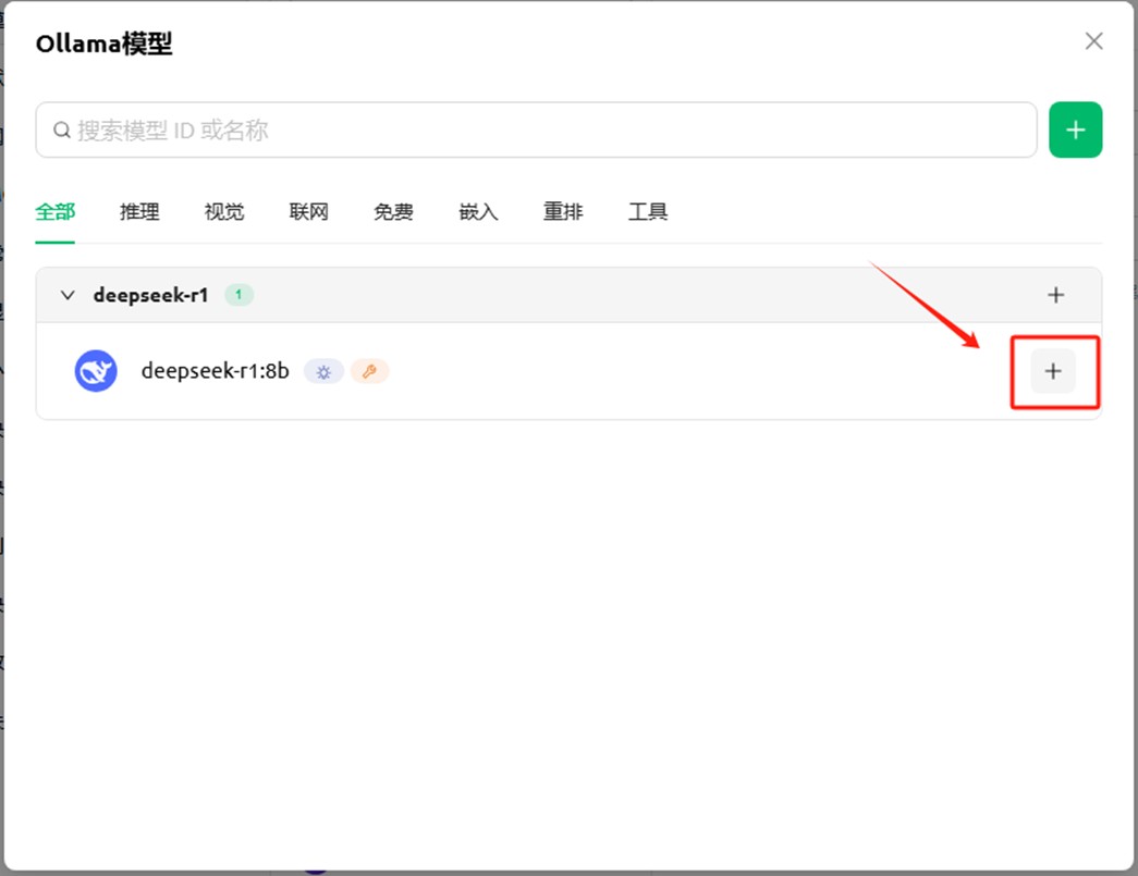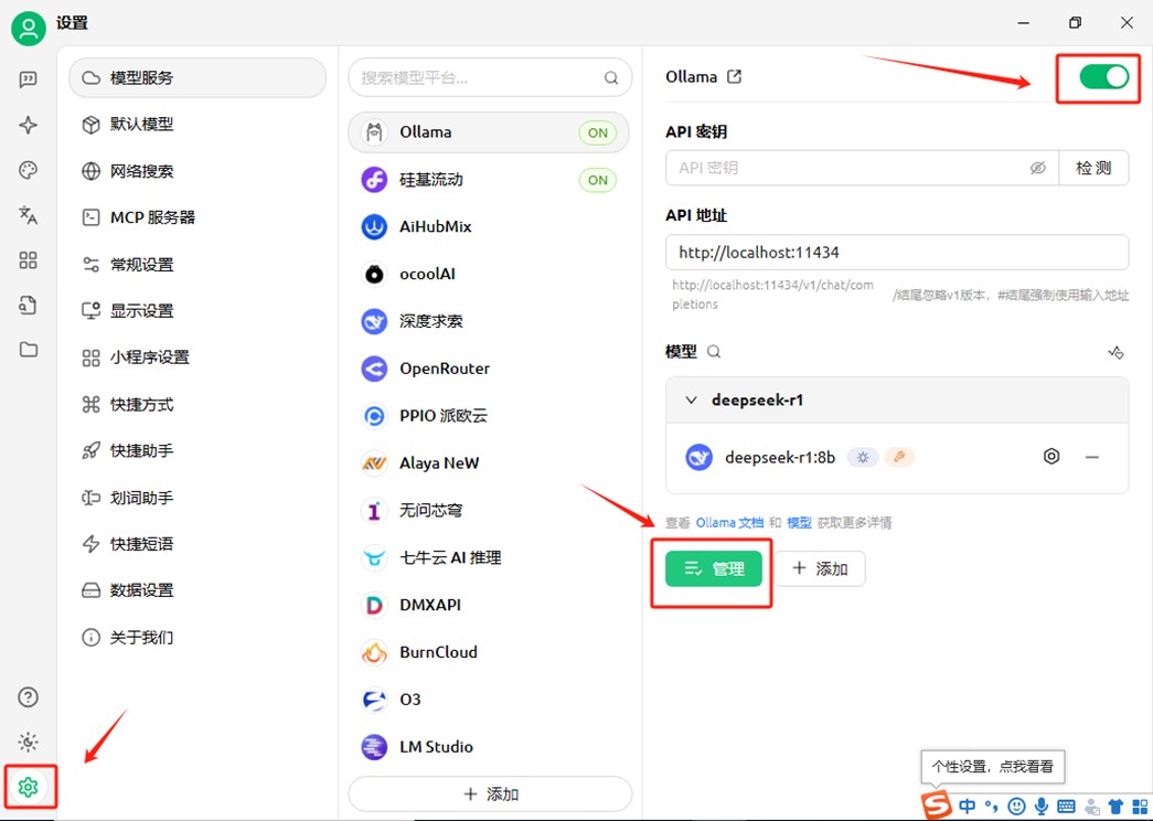9、安装完毕后进行如下操作,点开设置,开启ollama,点击管理,添加模型版本。