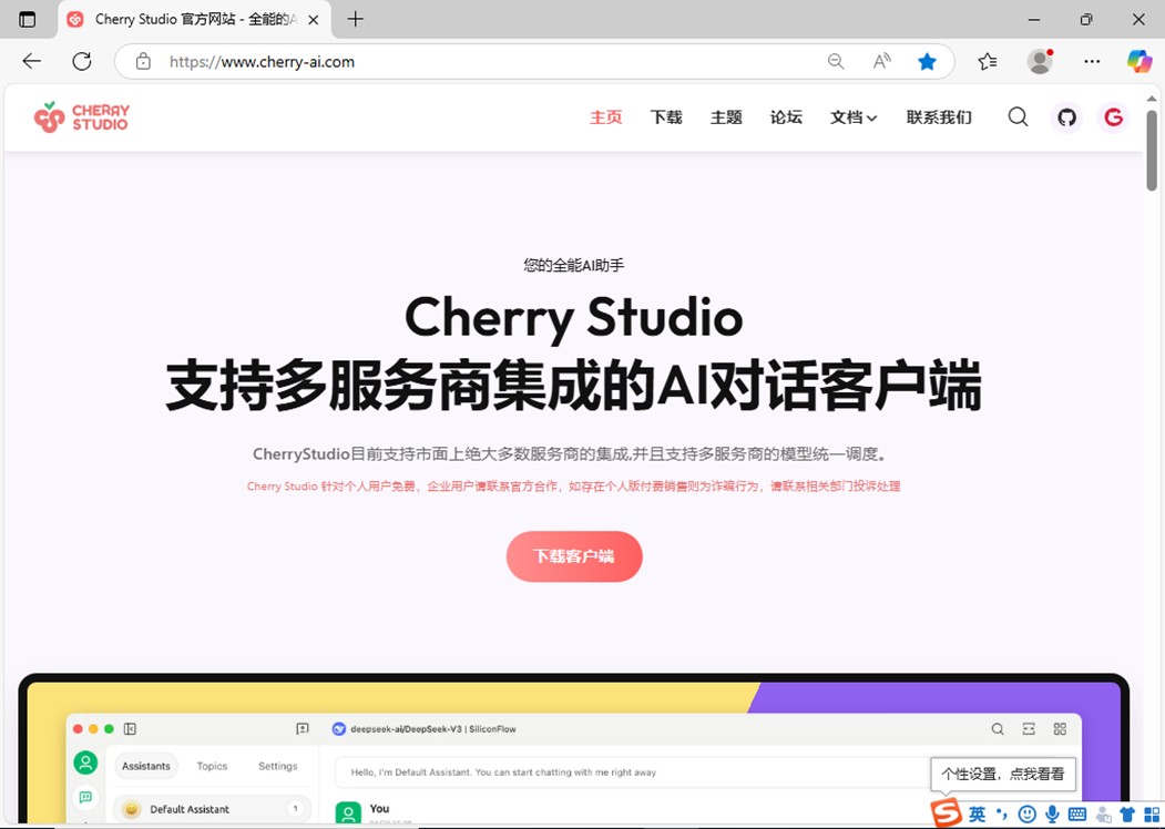 8、下载第三方工具(Cherry Studio),对接ollama API形成前端界面,达成窗口对话模式。官网:cherry-ai.com