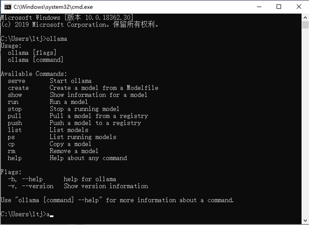 4、安装完成后打开cmd指令,输入ollama,显示以下界面后则安装成功(未成功则需要配置环境变量)。