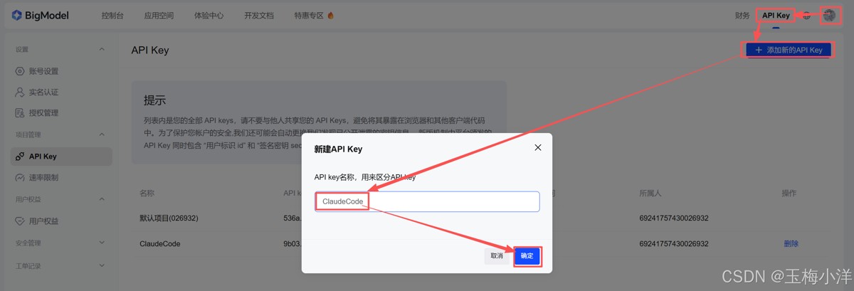复制 Key:创建成功后,系统会生成一串 API Key 字符。立即点击复制按钮,等着下一步使用。