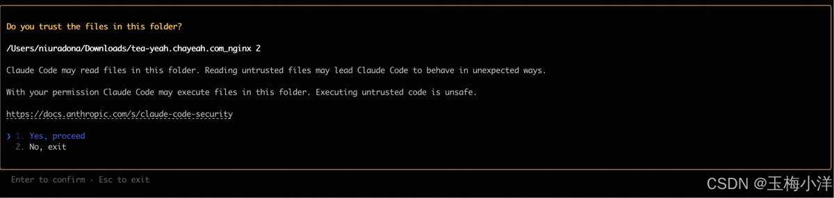 启动后选择信任 Claude Code 访问文件夹里的文件,如下: