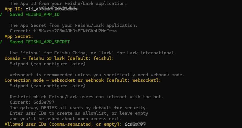 在命令行输入hermes gateway setup 可以配置聊天平台,选择配置Feishu,需要配置App ID ,App Secret ,User IDs,Domain默认feishu,Connection mode 默认websocket