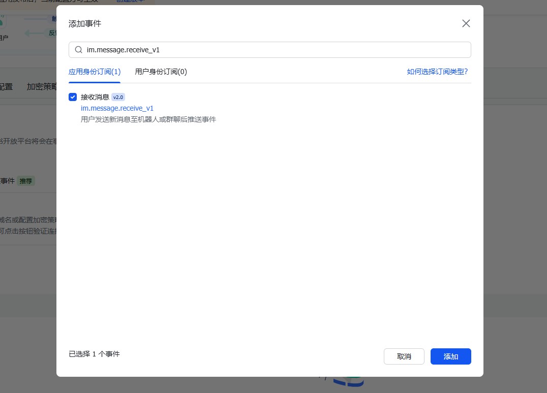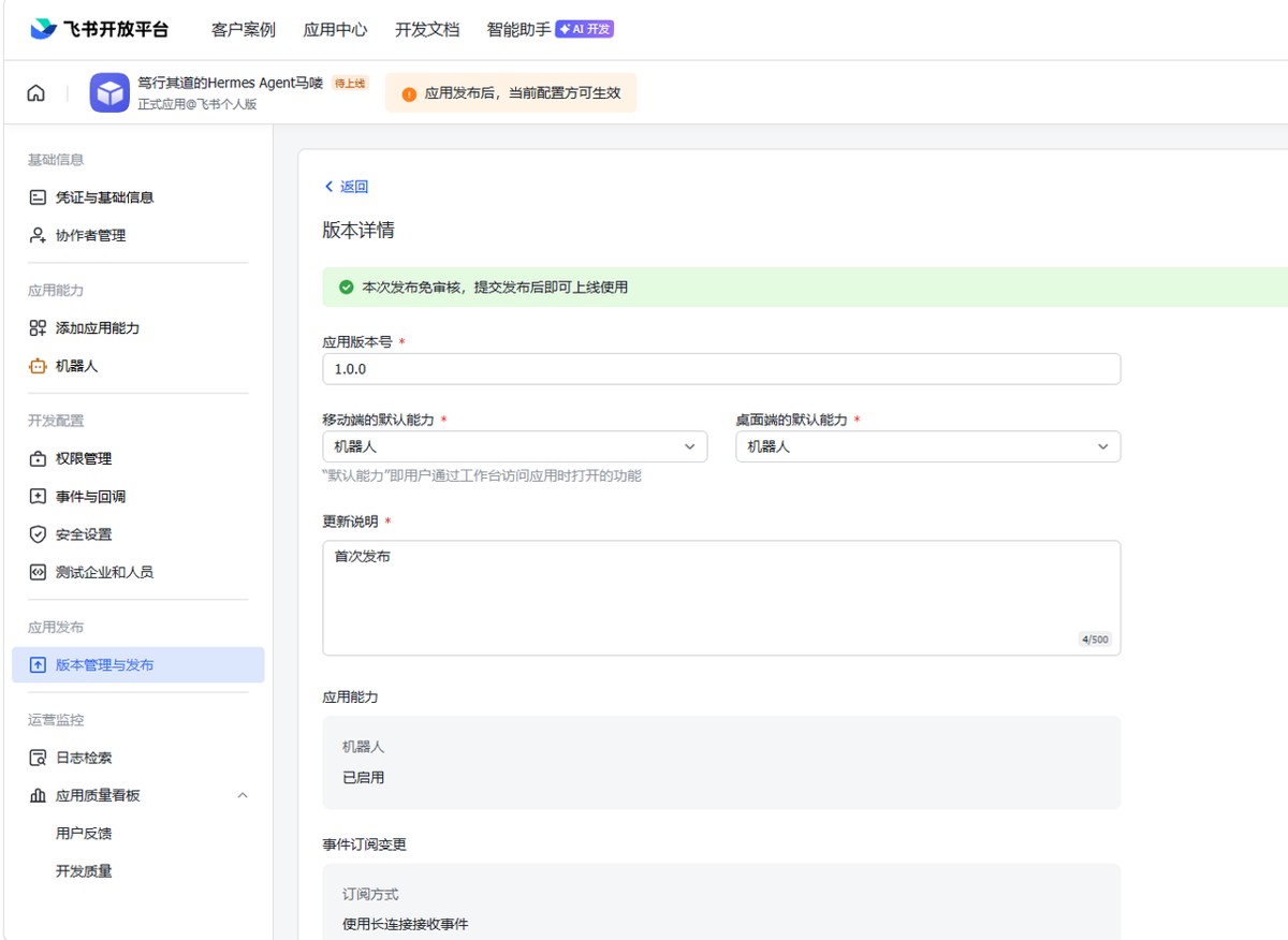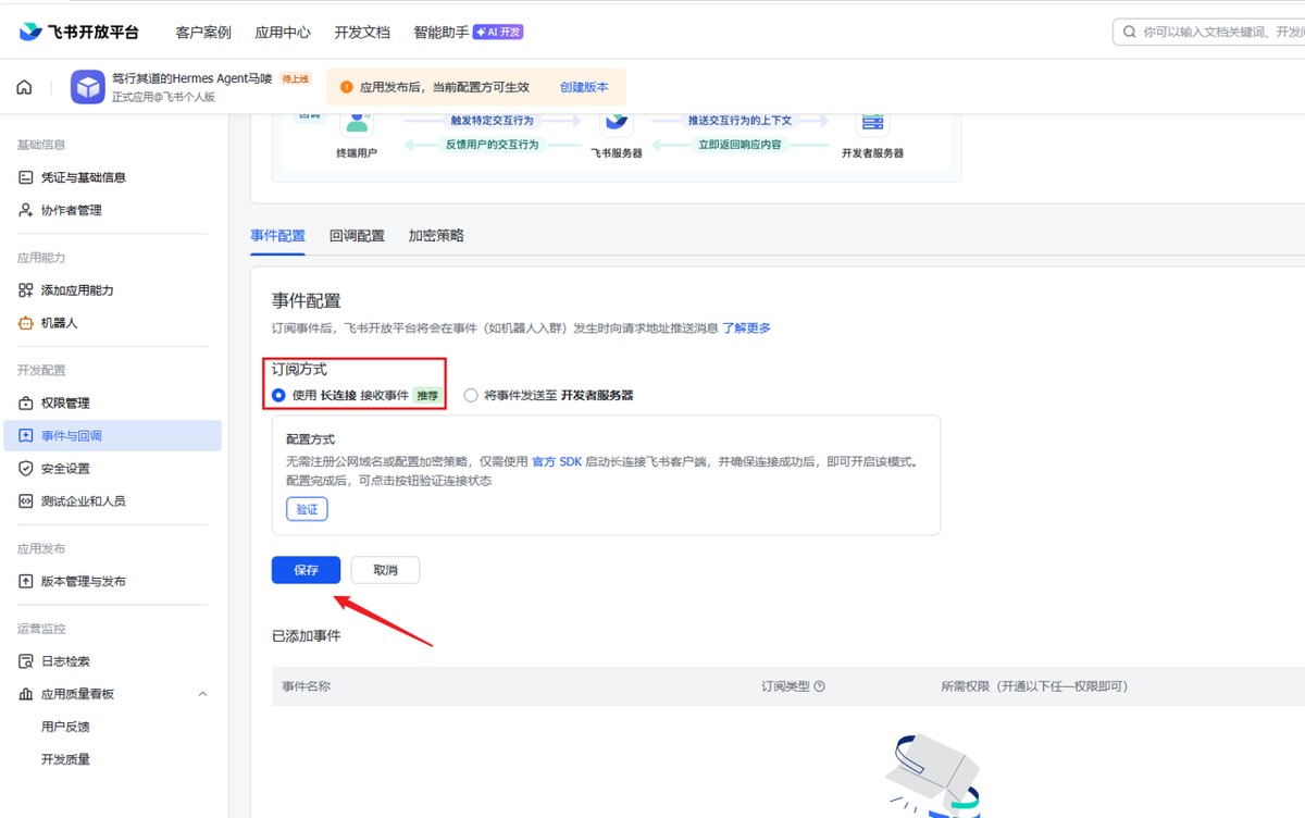 回到飞书开放平台,事件与回调中,订阅方式选择长连接