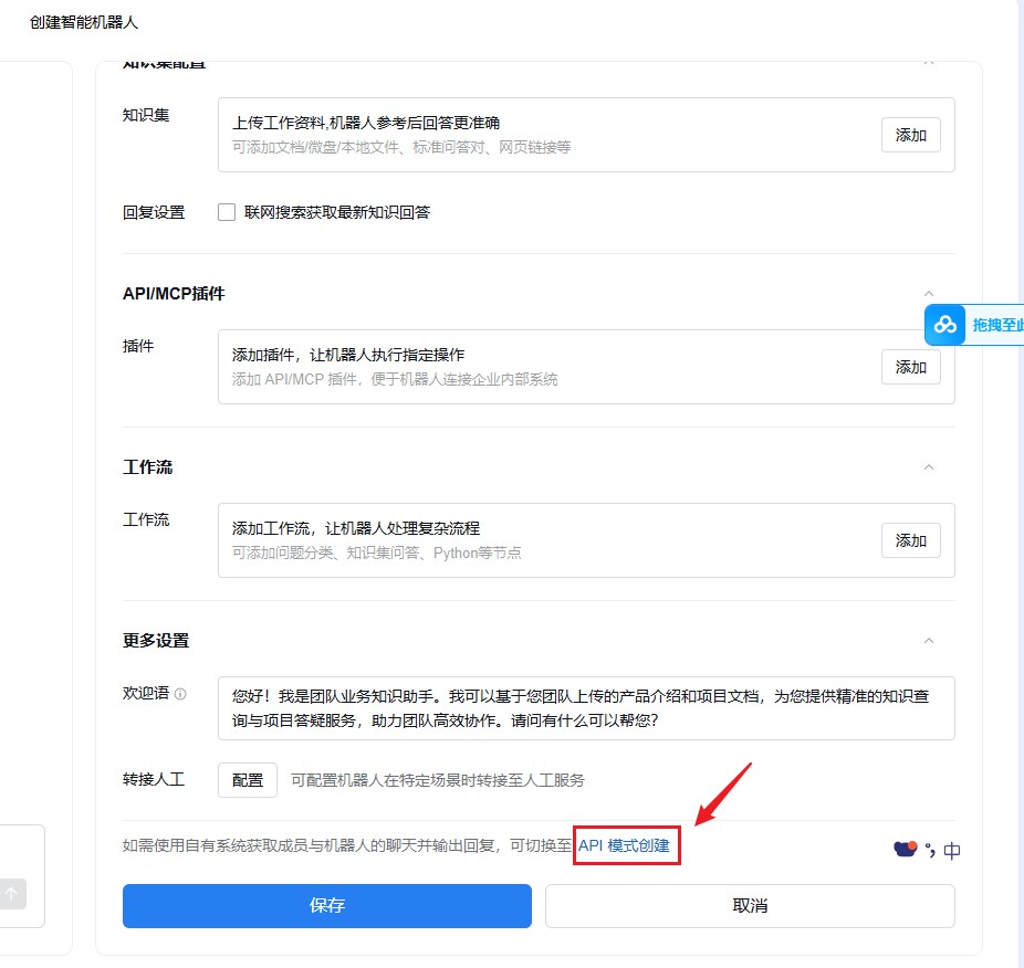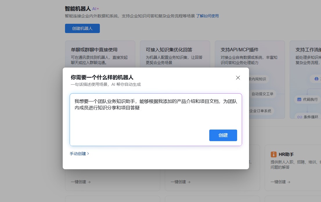 点击 创建机器人,用一句话描述使用场景后点击创建