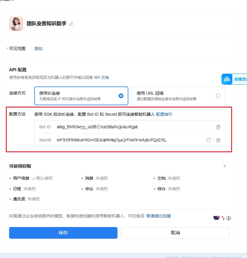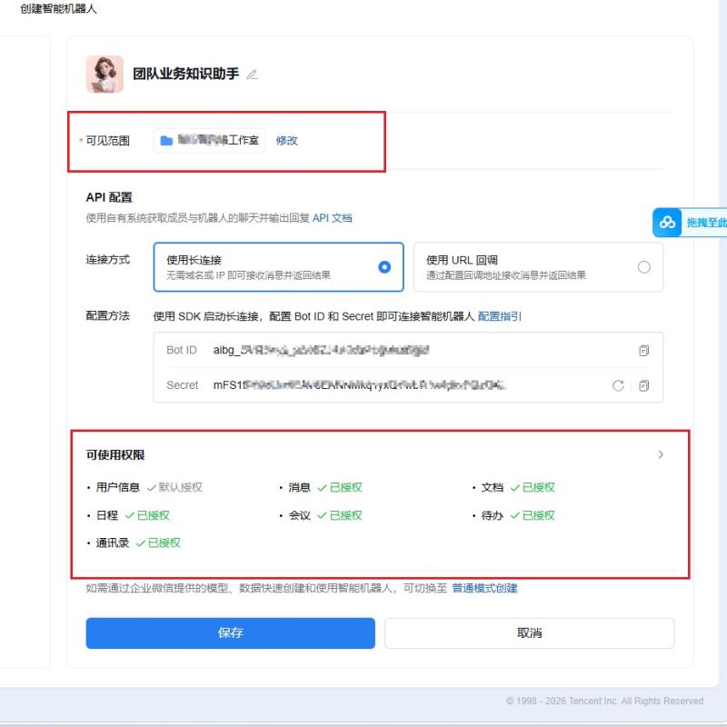 回到企业微信管理后台,配置可见范围和可使用权限,配置完成后点击保存