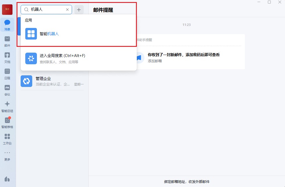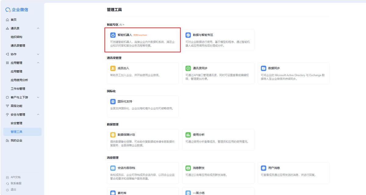 登录 企业微信管理后台,进入 管理工具 → 智能机器人