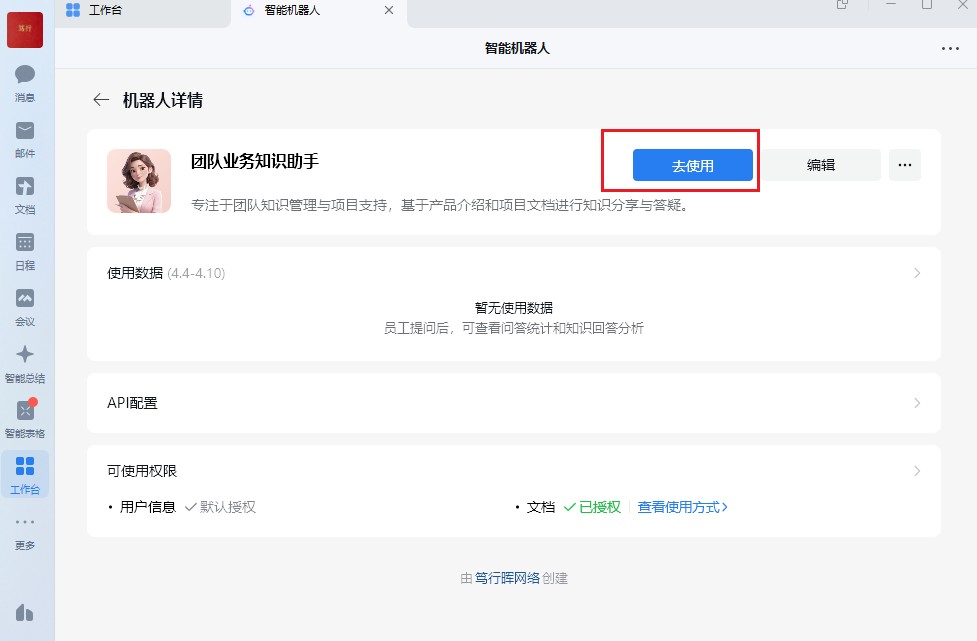 找到刚刚在企业微信管理后台创建的机器人,点击去使用