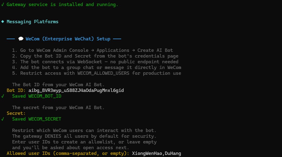 在命令行输入hermes gateway setup 可以配置聊天平台,选择配置WeCom,需要配置App ID ,App Secret ,User IDs