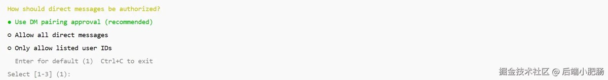 回到服务器命令行面板,在How should direct message be authorized?输入1,按下回车键,这个选项的意思是使用私聊配对授权 ,适合个人及小团队自用,最安全省心,输入后按下键盘上的回车键: