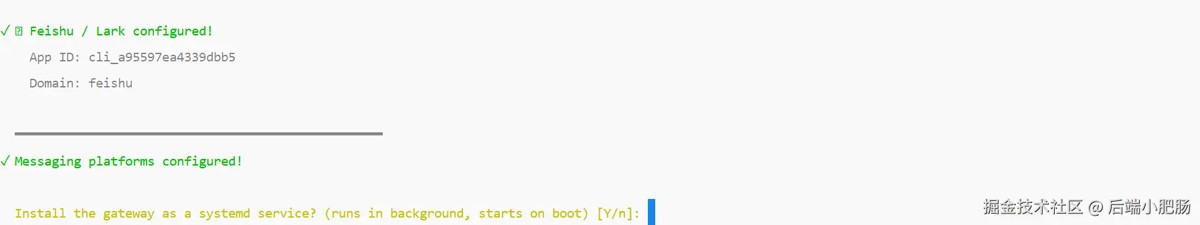 由下图How would you like to set up Feishu/Lark? 可知有两种配置飞书消息平台的方式,第一种是自动创建飞书机器人,第二种是输入已有飞书应用的AppID和AppSecret,我选择的第一种,按下键盘上的回车键: