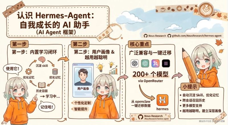 Hermes 官方给自己的定位很直接,是一个 self-improving AI agent,核心不是会不会聊天,而是有没有一条持续学习、持续复用的闭环,下面我们就来看看如何从OpenClaw迁移到Her2026-04-15