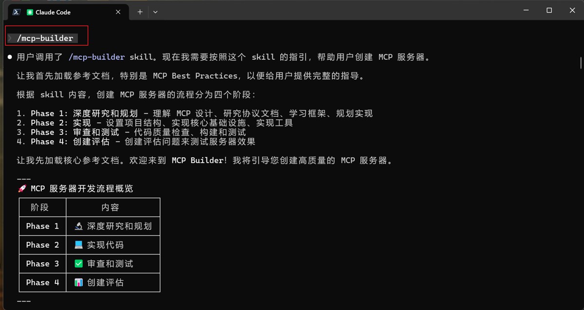 使用官方的 mcp-builder skill,顾名思义 — 它就是专门用来设计 MCP 的工具。