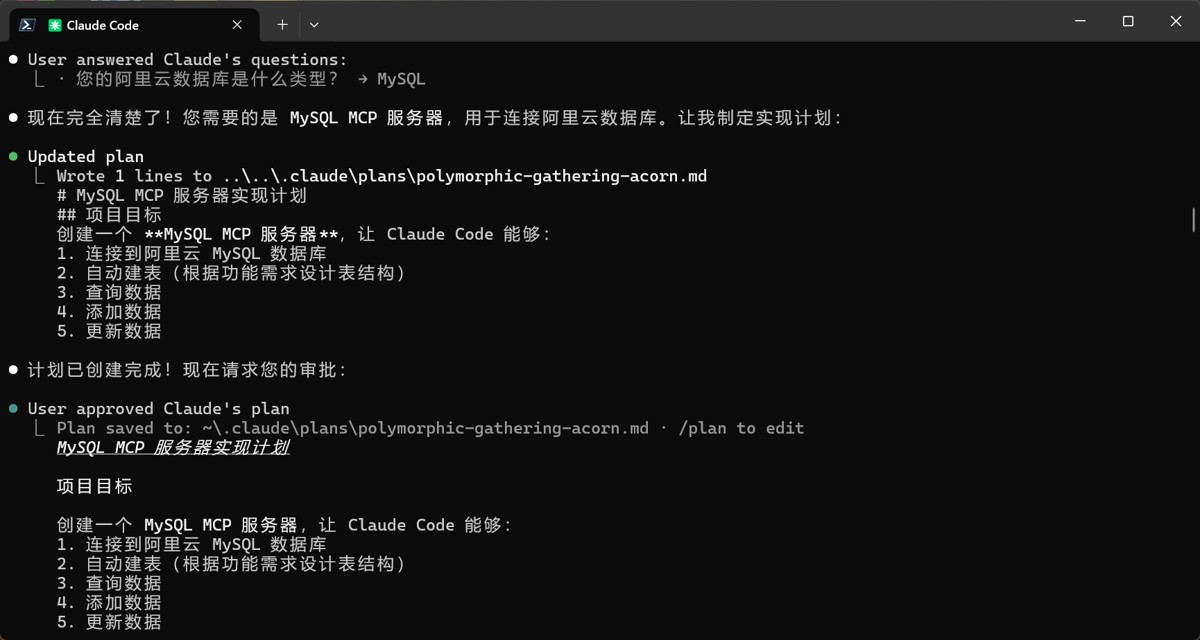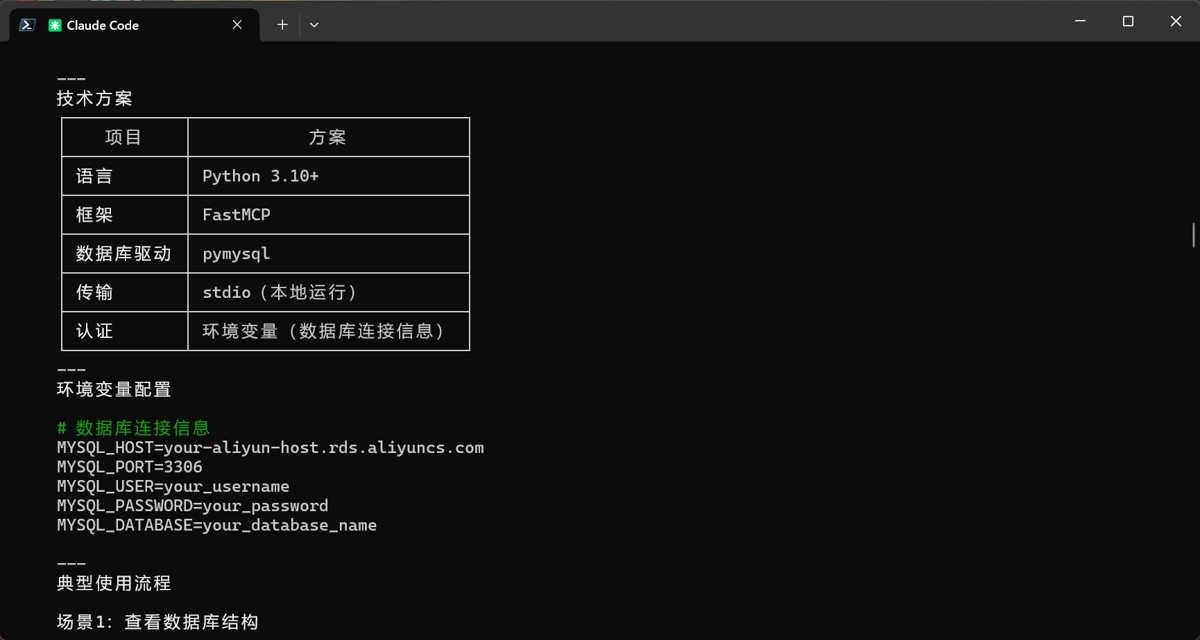 本文档记录了使用 Claude Code 的 mcp-builder skill 从零开始创建一个 MySQL MCP 的完整过程。