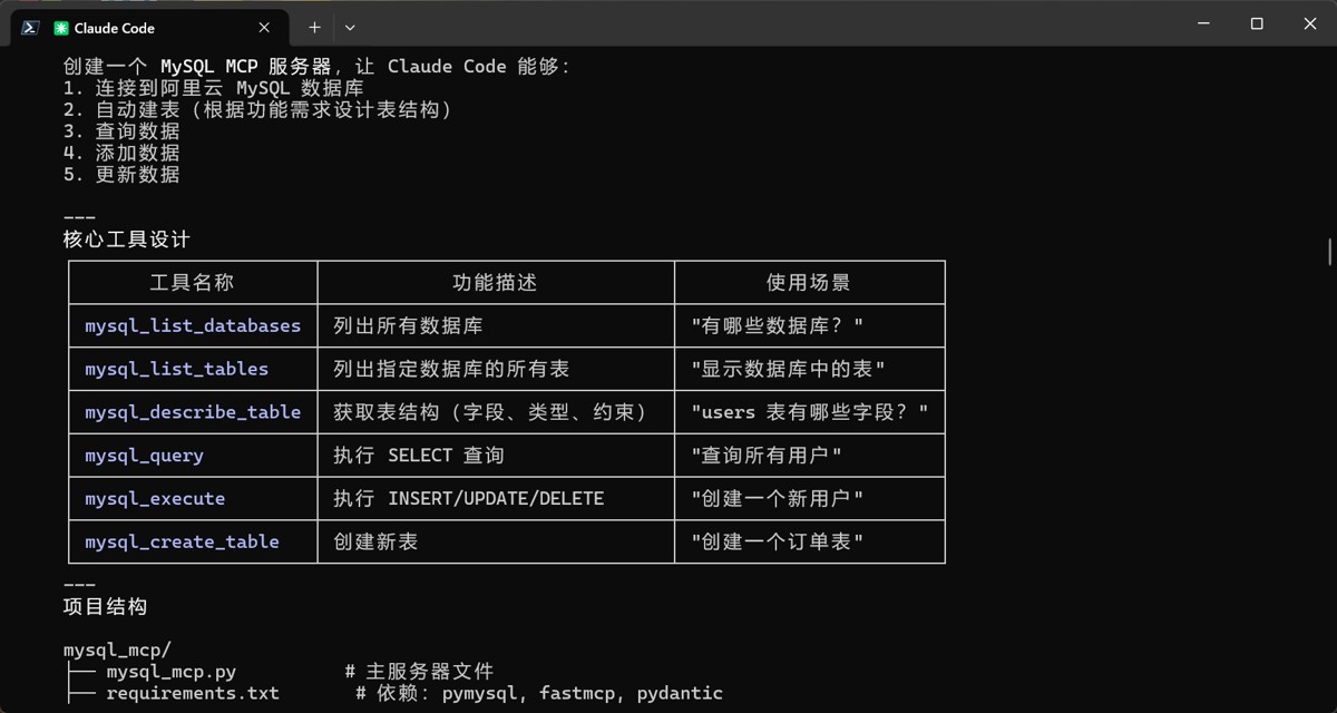 背景说明:我使用 skills 让 Claude Code 全流程自动创建了一个 MCP,这是一个能够让 CC 直接进行数据库操作的 MCP,我将其命名为 mysql_mcp。