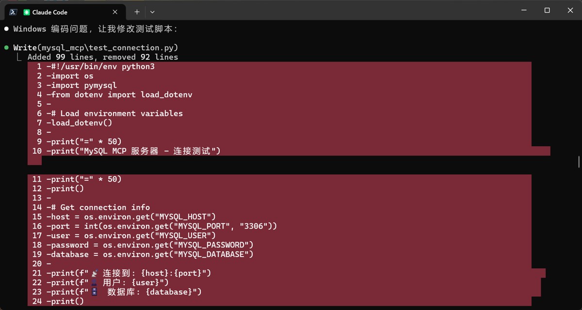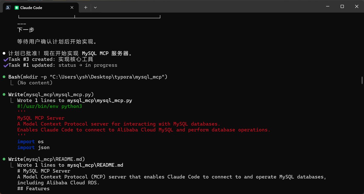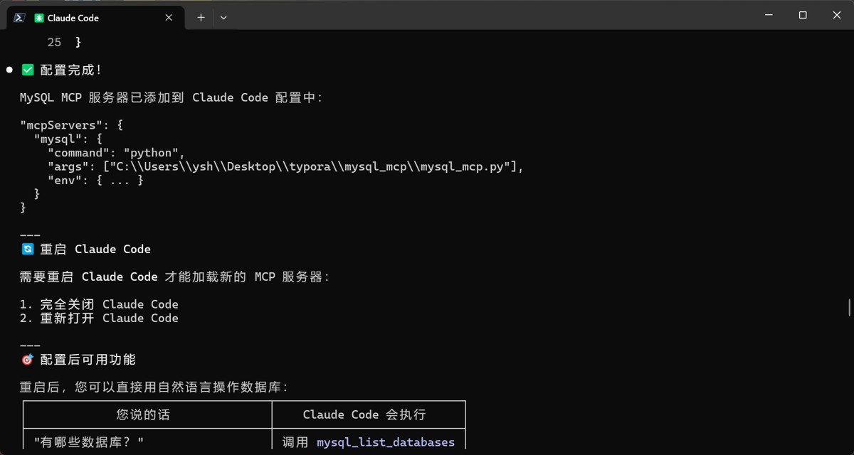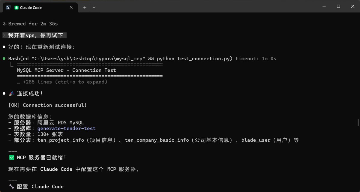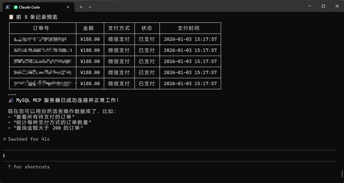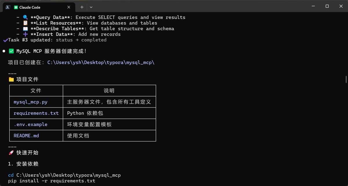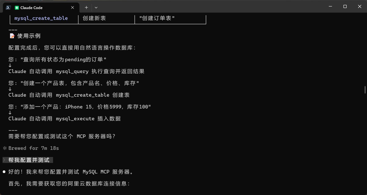 通过 Claude Code 的 mcp-builder skill,我们成功创建了一个功能完整的 MySQL MCP 服务。