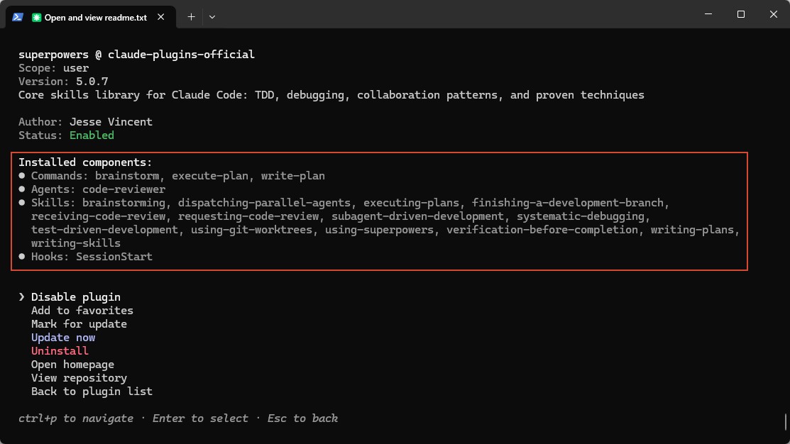 比如以下安装了superpowers,带来了commands、agents、skills和hooks。