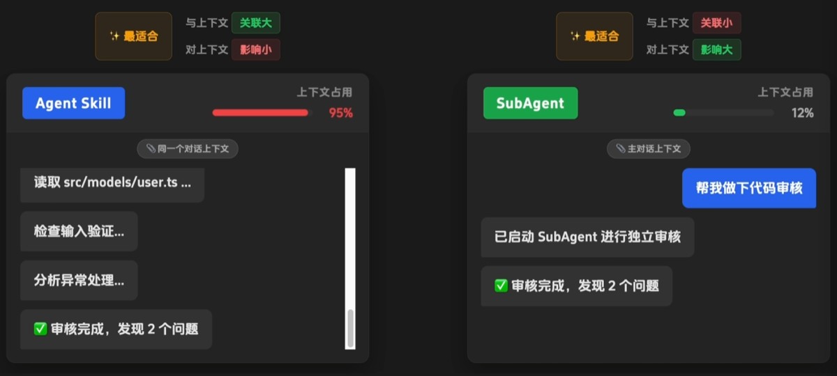 14. subagent和agent skill最大的区别是subagent拥有独立的上下文,不会将任务的上下文带给主agent,适合执行一些可以独立运行且可能会影响主agent上下文的任务。