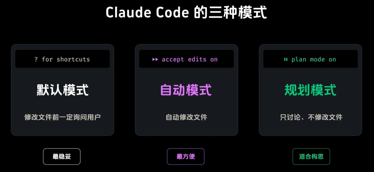 1. shift + tab 切换模式,包括accept edits on、plan mode on和默认模式三种