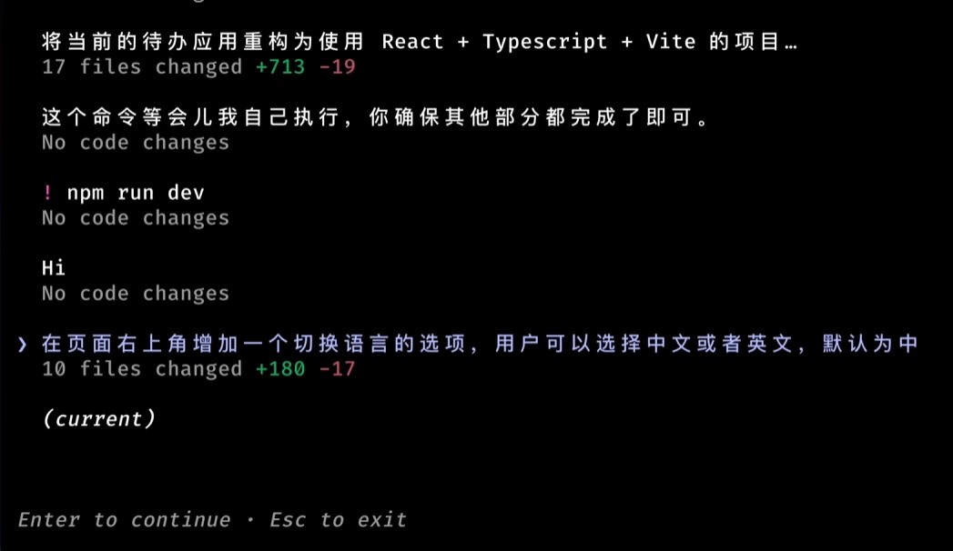 6. 回滚代码到上一个版本可以使用/rewind,或者按两下esc,就能够回滚到上一个节点了,不过cc只能回滚使用Write等工具写入的文件,不能够回滚Bash命令创建的文件夹或文件,建议版本控制还是使用git。