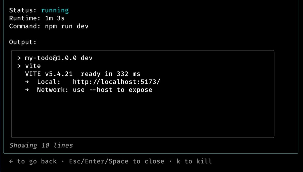 5. 当我们需要启动一个服务时可以直接在cc中使用 ! npm run dev,但是这样会阻塞cc,可以使用ctrl + b将服务后台运行,输入/tasks就可以查看服务了,k可以终止服务。